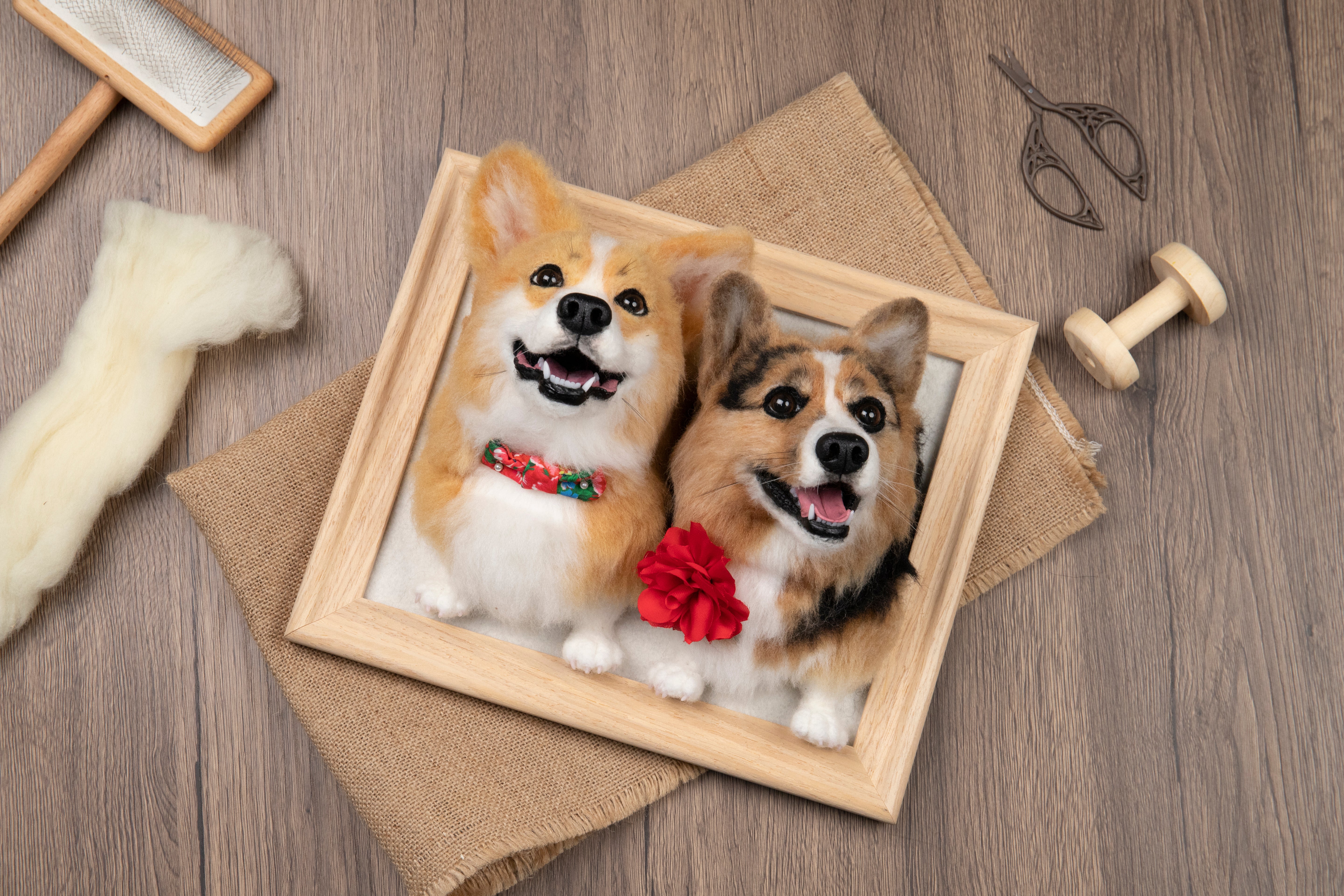 Each Woolever Friend is custom-made exclusively for your pet using the needle felting technique with 100% natural, soft wool. Needle felting involves compressing wool fibers together by hand to create specific textures and shapes. The nose and mouth of each Woolever Friend are also handmade. Full-body Woolever Friends include a wireframe to support the stability and mobility of the paws and tail.